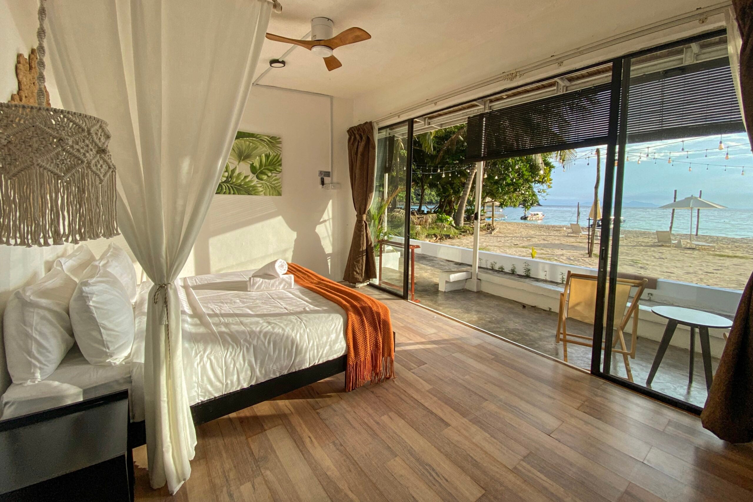 Wide bay windows allow majestic views of the beach and crystal clear ocean water.