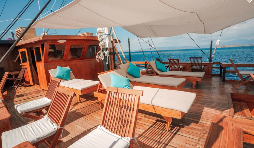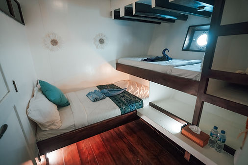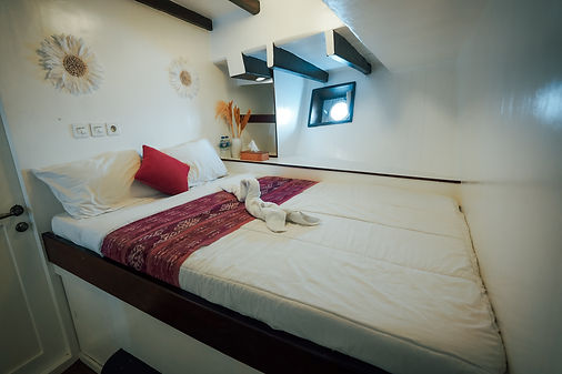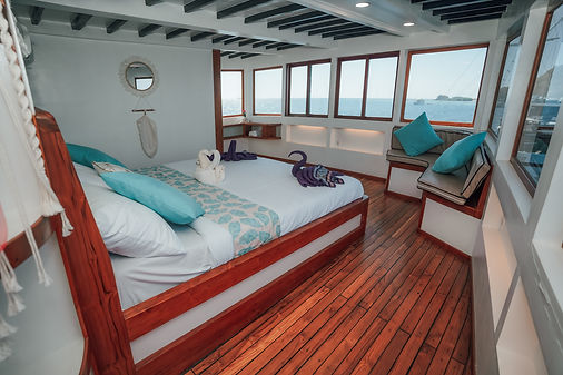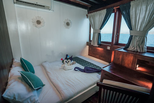 Spacious cabin with a double bed, private ensuite bathroom, and stunning sea views.