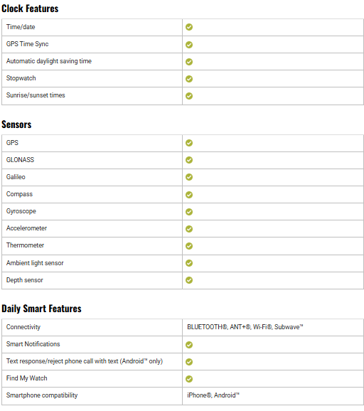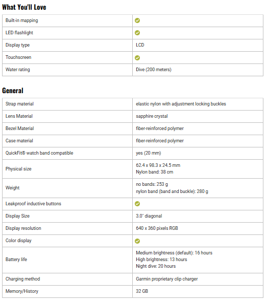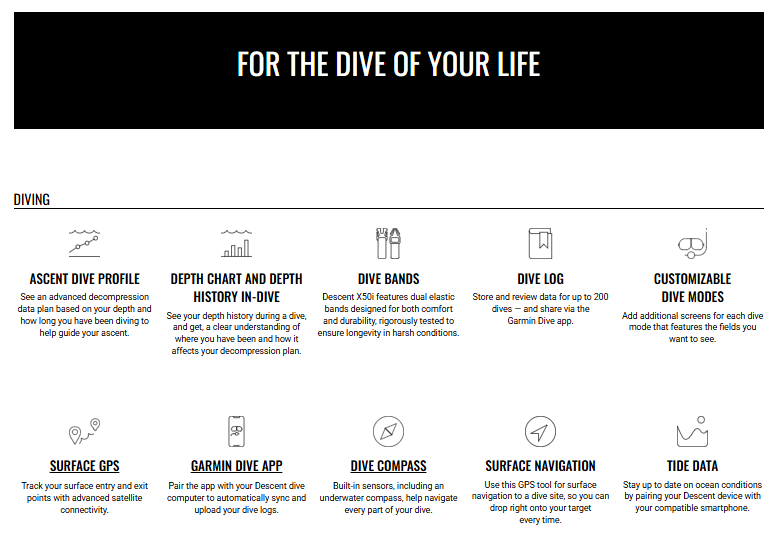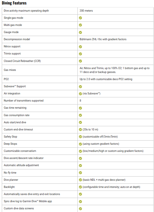 • Dive Log Function – Stores and reviews up to 200 dives, which can be shared via the Garmin Dive app.